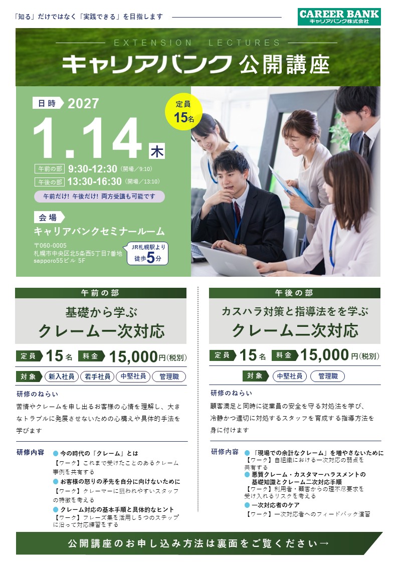 2027年01月14日(木) 午後 カスハラ対策と指導方法を学ぶクレーム二次対応